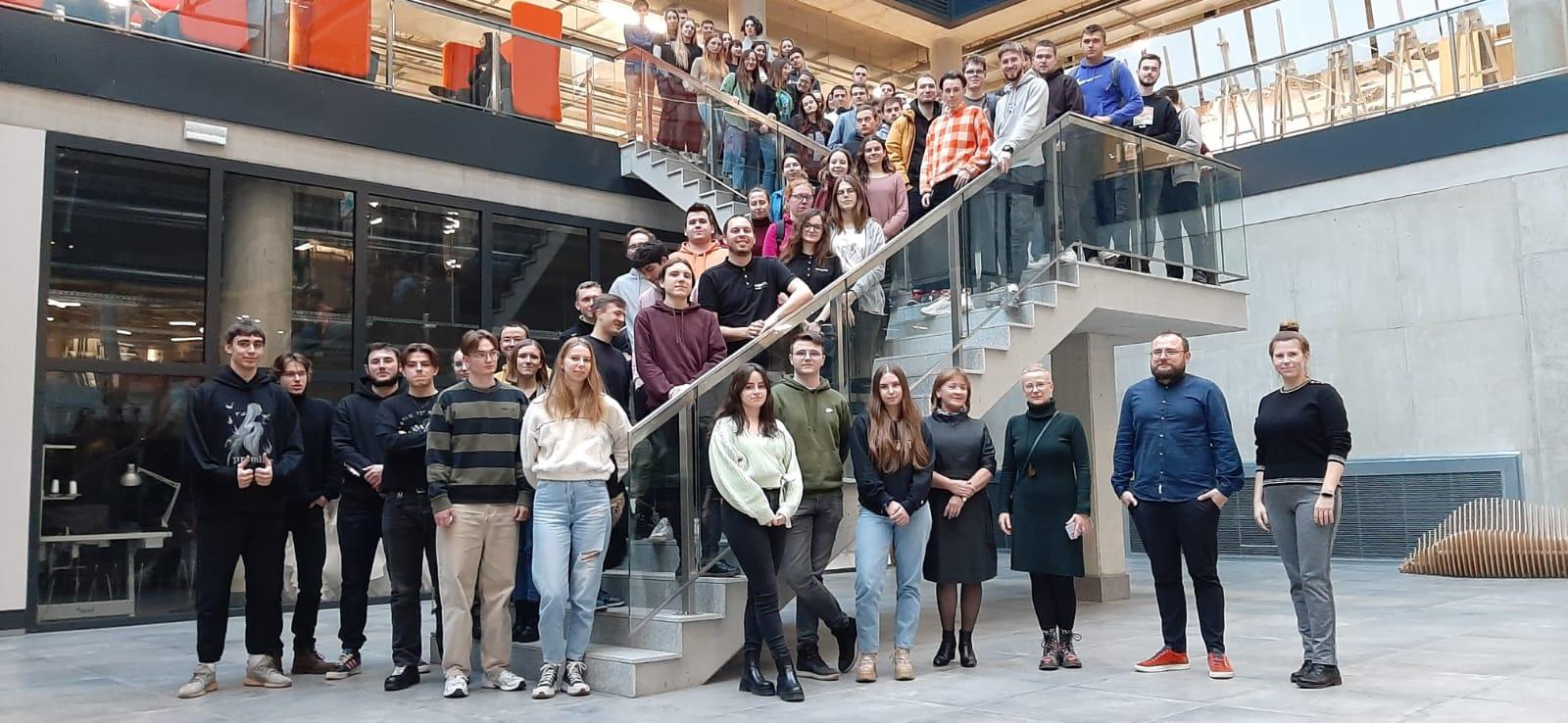 UCzestnicy na schodach w halu wydziału