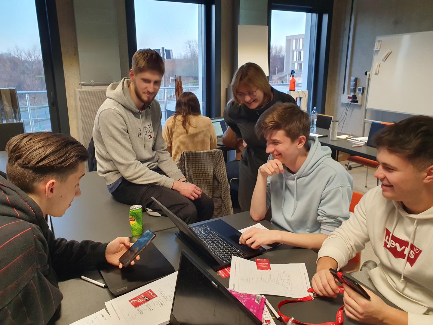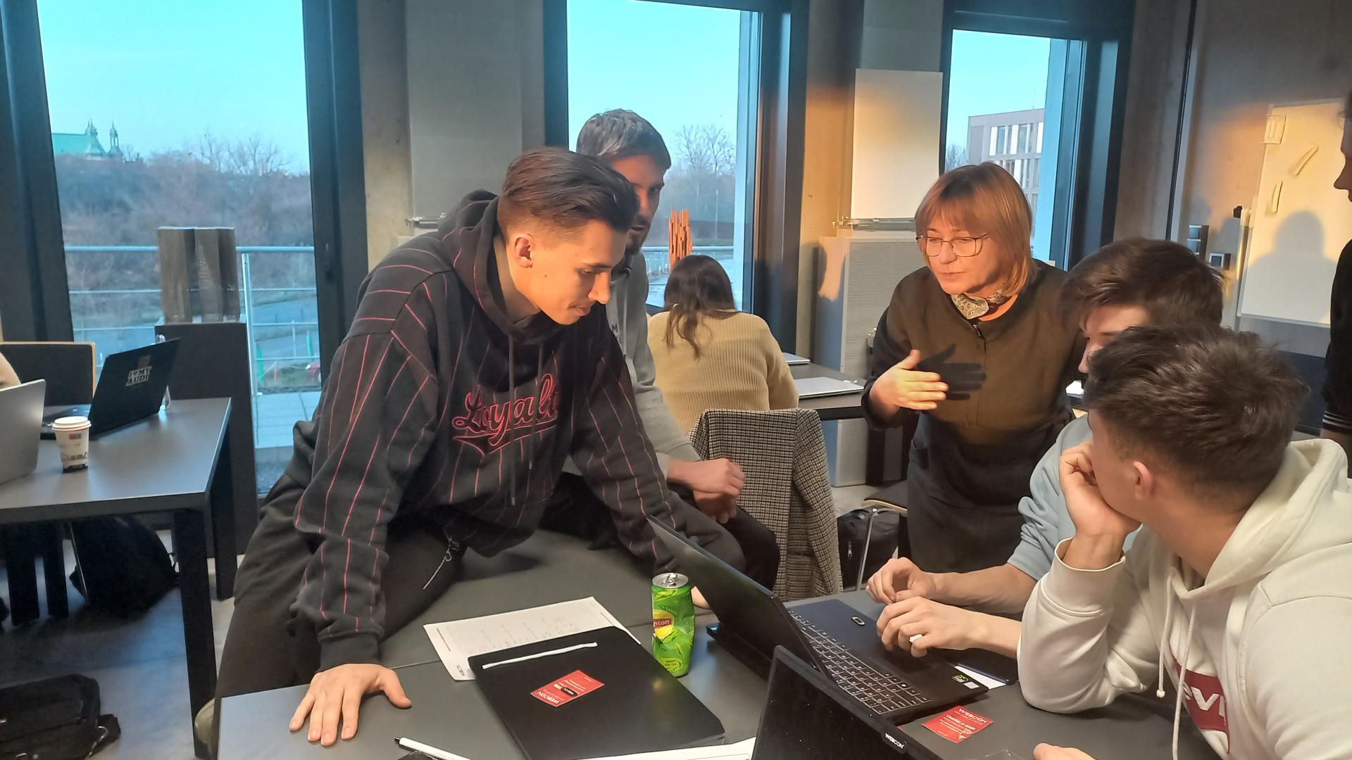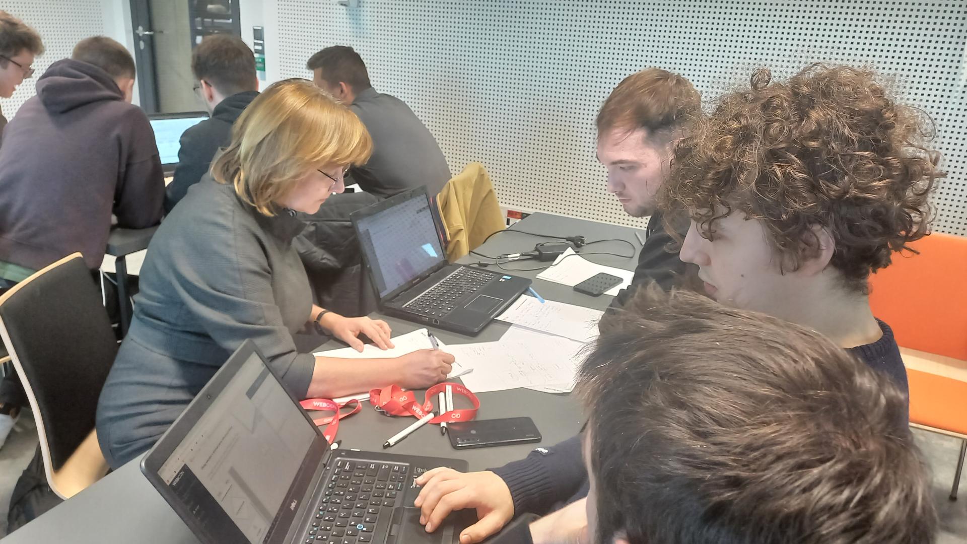 uczestnicy pracujący w grupach na laptopach